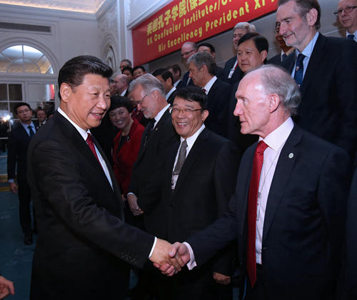 習近平指出,近年來,孔子學院在英國快速發展。目前,英國已經建立起29所孔子學院和126個孔子課堂,數量居歐洲之首。全英孔子學院取得的碩果也是中英人文交流蓬勃發展的縮影。通過人文交流,中英兩國文化中的精華正在對兩國人民的思維方式和生活方式產生著奇妙的“化學反應”!盀橹粎,誨人不倦!毕M谧魑唤處熢俳釉賲,為中英友好事業添磚加瓦。希望孔子學院繼續秉承“相互尊重、友好協商、平等互利”的校訓,為傳播文化、溝通心靈、促進世界文明多樣性作出新的更大貢獻。