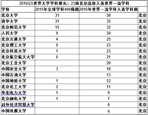 中國7所大學的65個學科全球排名前50,在去年50個學科的基礎上新增23%。其中北大26個,清華21個,上海交大9個,復旦4個,同濟3個(建筑、土木工程、藝術設計),浙江大學(化工42)和中國農業大學(農林22)。