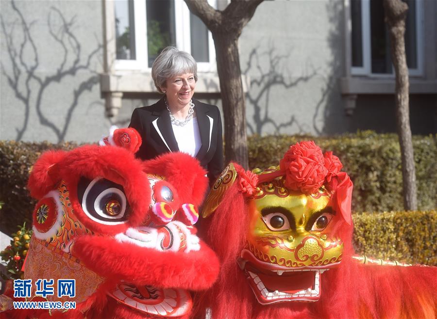 2月1日,英國首相特蕾莎·梅在北京出席在英國駐華大使官邸舉辦的文化招待會。這是特蕾莎·梅與舞獅合影。 新華社記者 金良快 攝